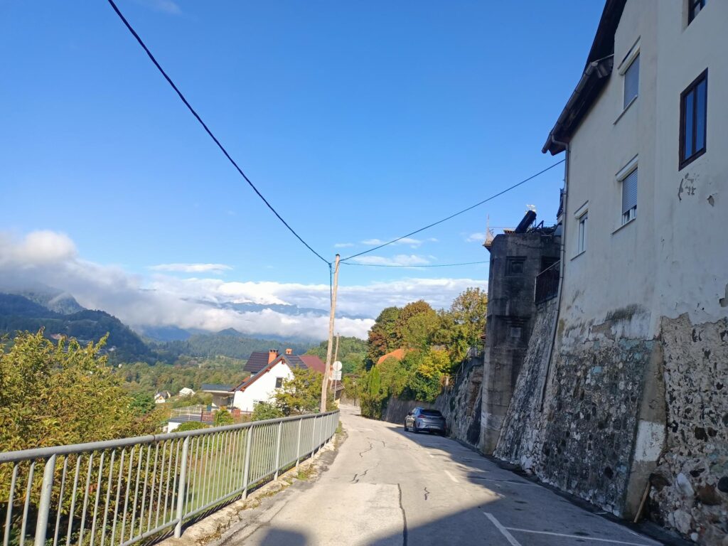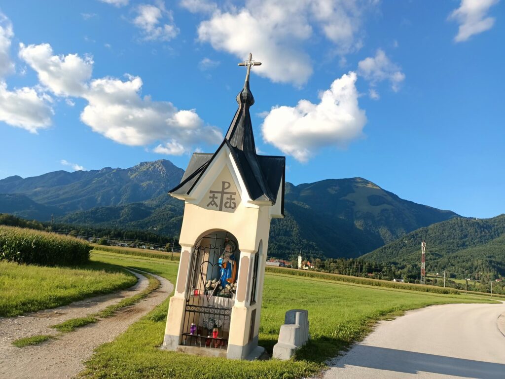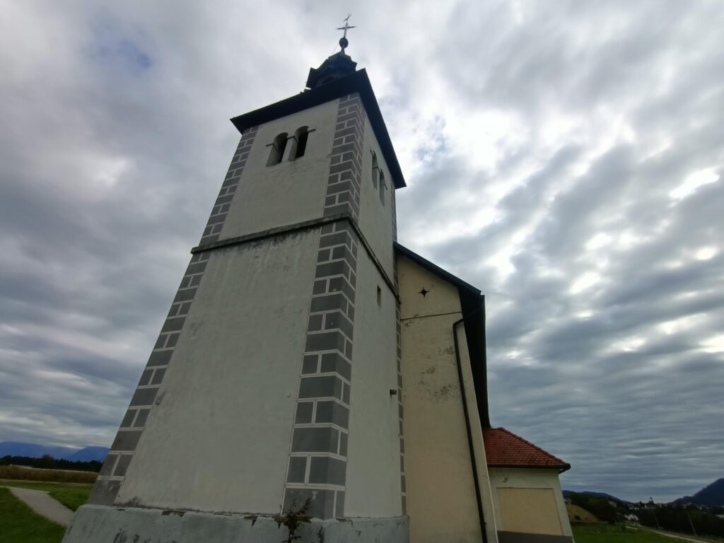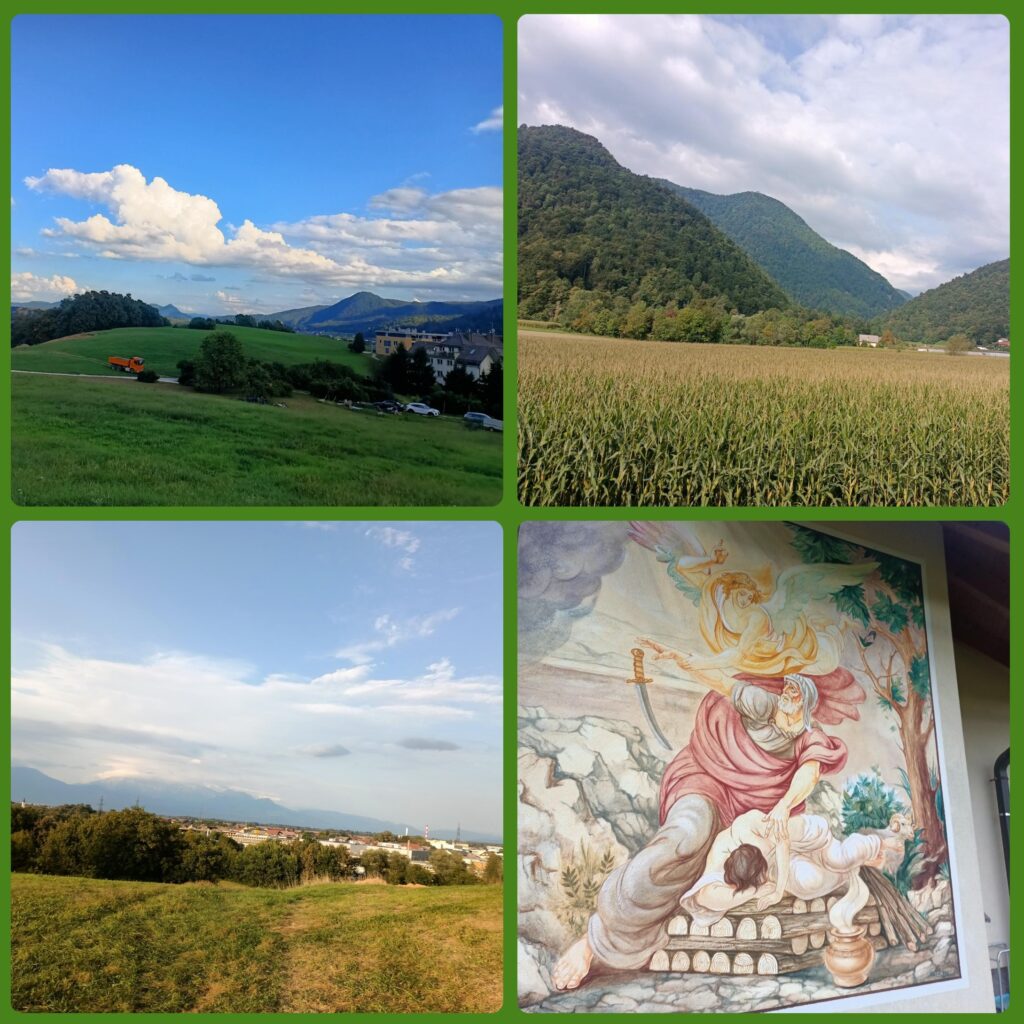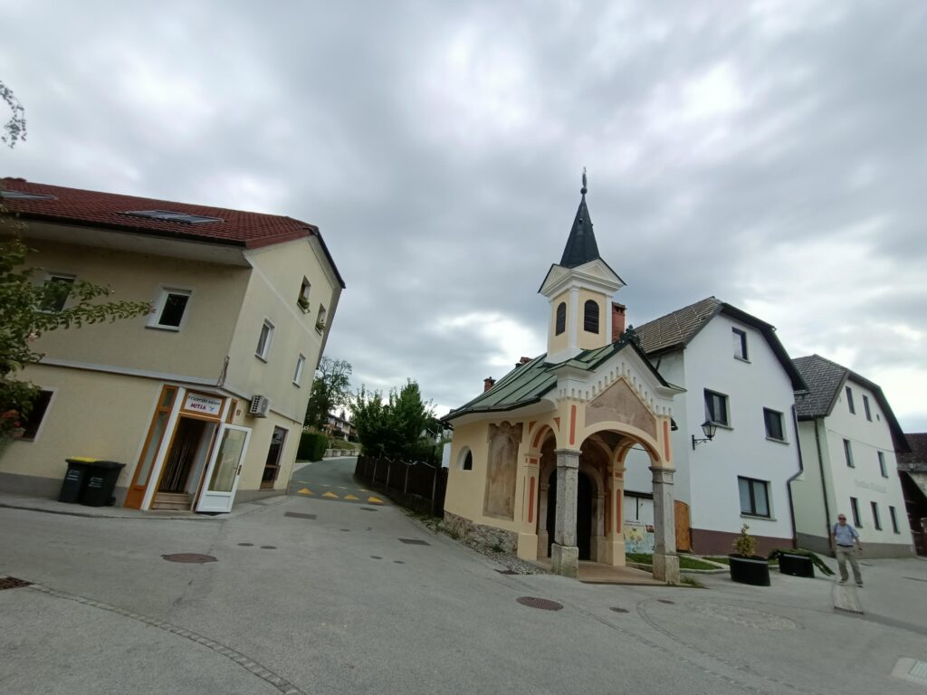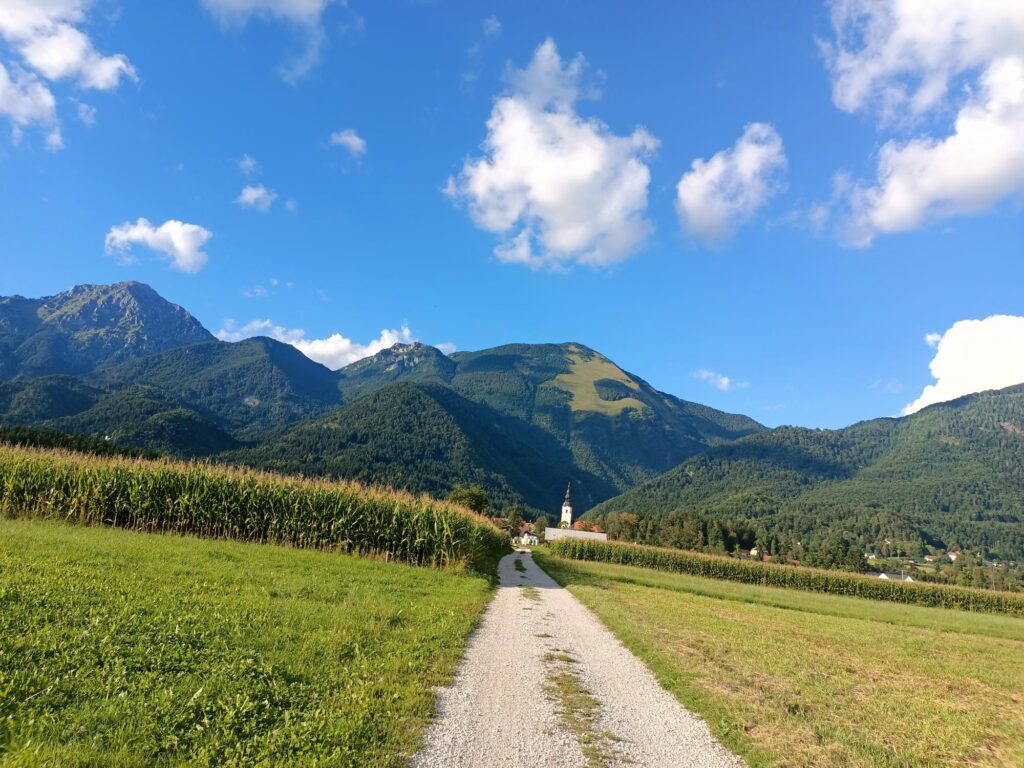 Z centrum wyruszyłem na spacer po okolicznych wiejskich terenach, gdzie wśród pól, łąk, i łagodnych wzgórz można zapomnieć o wszystkich problemach i kontemplować widoki na okoliczne masywne góry. Szedłem polną drogą, mijając ładną kaplicę, i dotarłem do małej wioski Breg ob Kokri. Tylko 100 mieszkańców, ale i tak mają kościół. Co z tego, skoro do świątyni nie da się dotrzeć – leży dosłownie na czyimś podwórku.