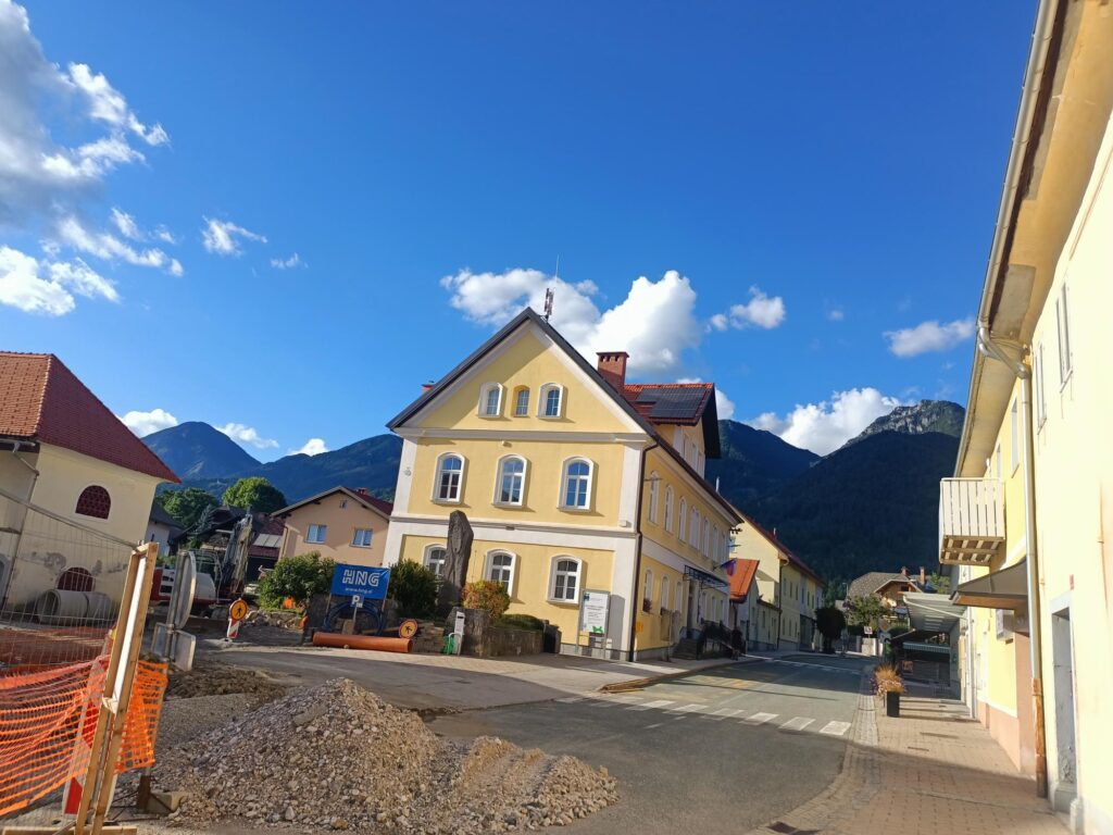 Miejscowość powstała pod koniec średniowiecza i przez długi czas była wsią, dlatego brak tam starówki. Zwiedzanie zacząłem od wielkiego parkingu w centrum. Obok niego – pojedyncze zabytkowe budynki, namiastka rynku, na którym odbywał się jakiś lokalny kiermasz, i charakterystyczny budynek marketu Mercator, ze szklaną piramidką zamiast dachu. Z budynku dobiegała muzyczka, słyszalna kilometr dalej. Naprawdę. Lekko przesadzają.