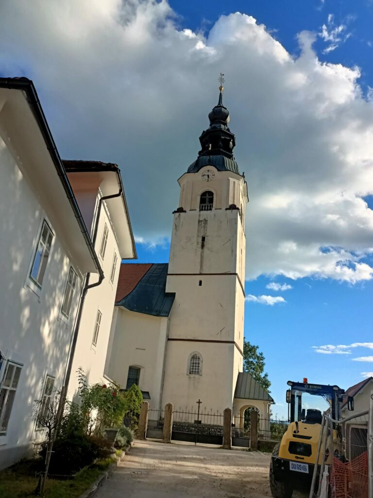 Następnie poszedłem do serca Stražišča, czyli na rynek (Baragov trg). Droga ze skoczni nie krótka, ale przyjemna. Na rynku nie było jakichś szczególnych zabytków – z wyjątkiem kościoła św. Marcina (pierwszy kościół stał tam w VI wieku) – ale miejsce jest schludne.