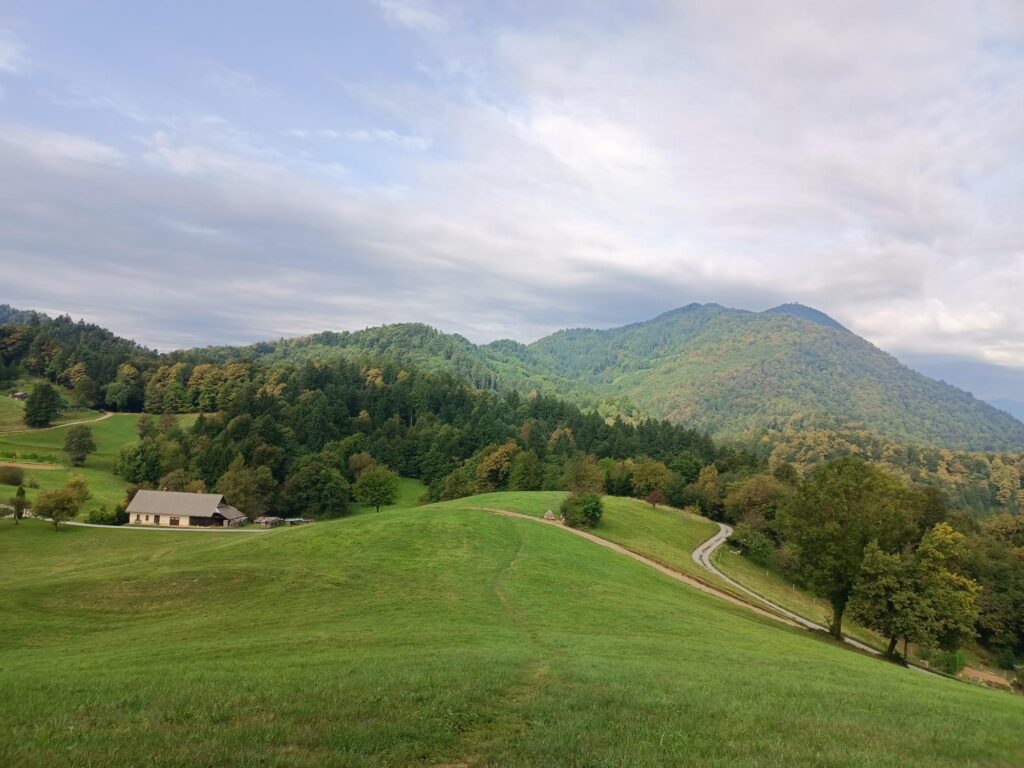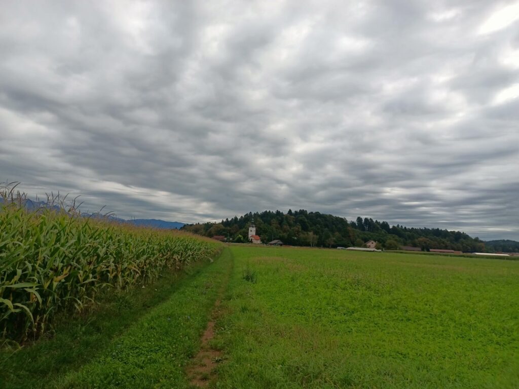 Poszedłem więc z powrotem i przez pola doszedłem do kolejnej wsi sąsiadującej z Preddvorem – Hrib liczy tylko 64 mieszkańców. Zanim zdążyłem obejrzeć miejscowość, ona już się skończyła.