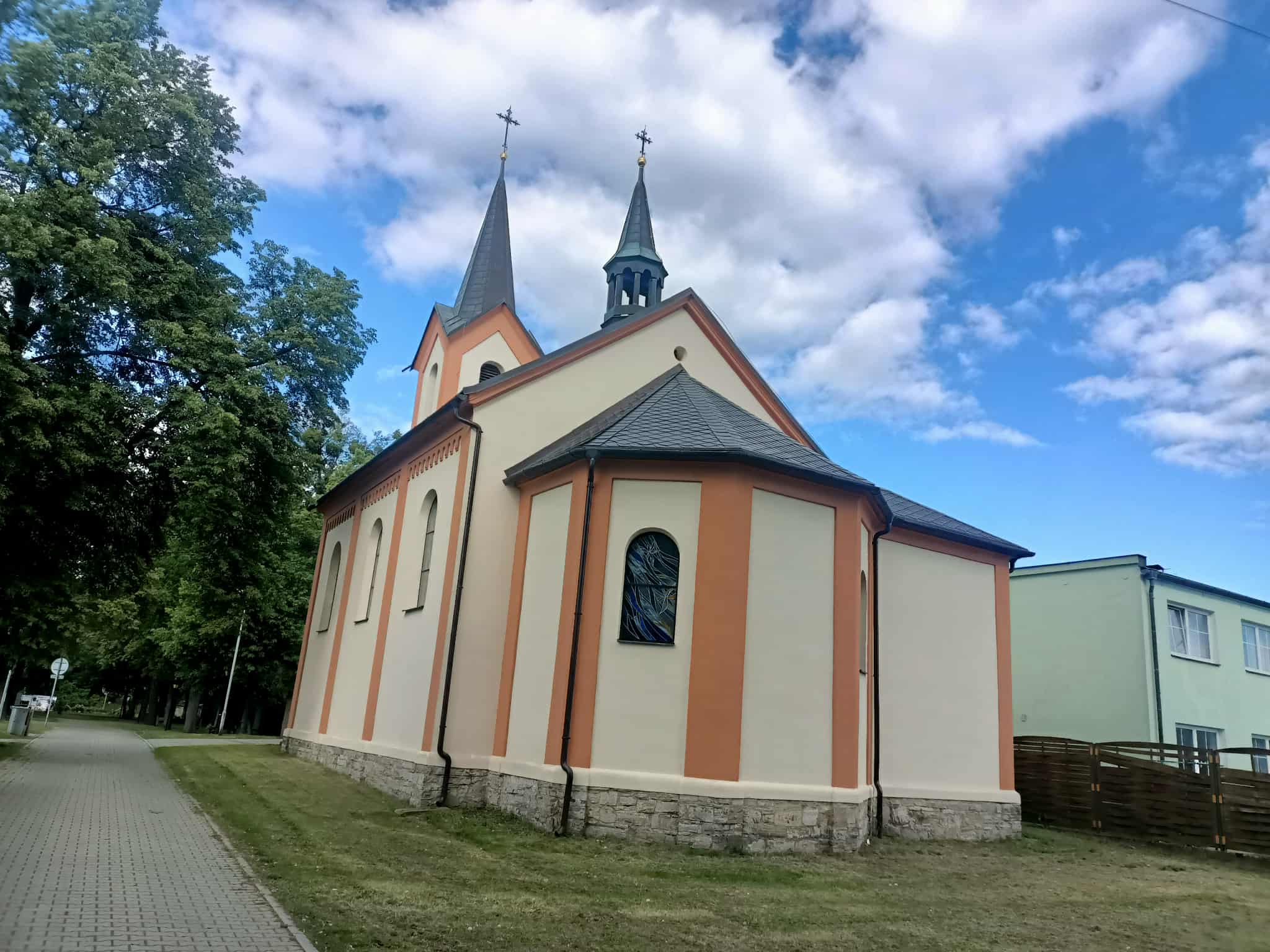 Ciekawe są też dwa zabytkowe kościoły. Pierwszy to ikoniczny, obecny we wszystkich przewodnikach renesansowo-barokowy Kościół św. Jakuba Starszego, wybudowany w 1644 roku na miejscu spalonej drewnianej świątyni. Kościół ma charakterystyczną wieżę, budowaną na przestrzeni 41 lat. Zapewne przerywano prace podczas epidemii czy wojny z Turcją. Albo brakowało funduszy, bo wszystkie pieniądze Czesi wydali na piwo. Na zewnątrz stoją kolumny: św. Pawła i św. Piotra.
